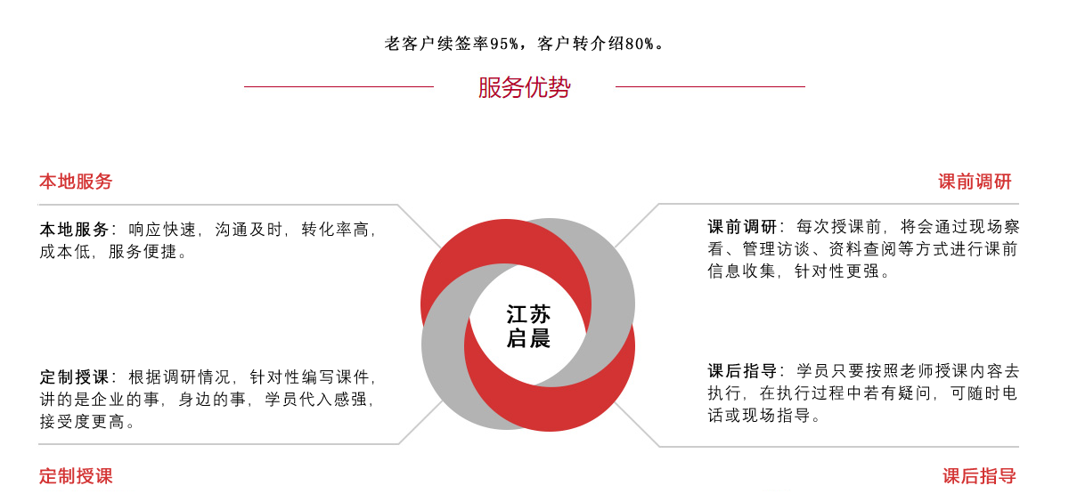 企業(yè)培訓(xùn)>首選>江蘇啟晨!制造業(yè)的理想選擇!江蘇啟晨企業(yè)管理咨詢有限公司位于風(fēng)景秀麗的江蘇省宿遷市。公司由國內(nèi)知名高校及全球500強(qiáng)企業(yè)內(nèi)頂尖的學(xué)者、教授、企業(yè)培訓(xùn)導(dǎo)師、企業(yè)顧問等共同打造的一家專業(yè)的管理咨詢與培訓(xùn)機(jī)構(gòu)。公司專注于企業(yè)生產(chǎn)管理、現(xiàn)場管理、質(zhì)量管理、安全管理、市場與銷售、人力資源管理、財(cái)務(wù)管理、班組管理、員工管理、內(nèi)訓(xùn)?�